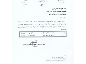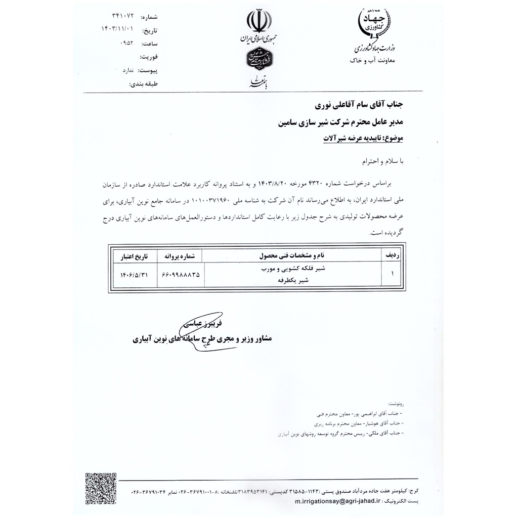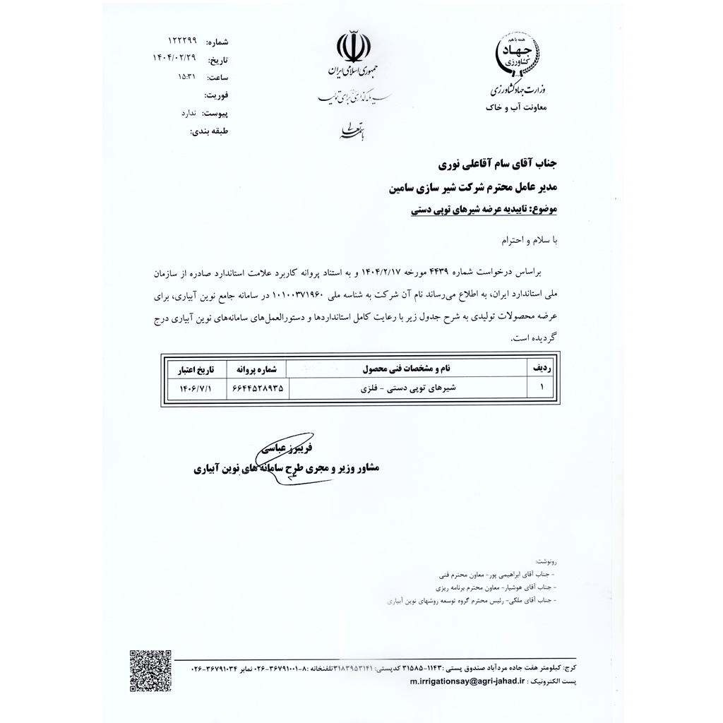 در همين راستا بعنوان اولین شرکت تولید کننده شیرآلات برنجی در ایران موفق به اخذ تاییدیه عرضه شیرآلات ( شیر فلکه ها کشویی، شیرهای یطرفه مورب و شیرهای توپی برنجی) از وزارت جهاد کشاورزی، معاونت آب و خاک نیز شده است